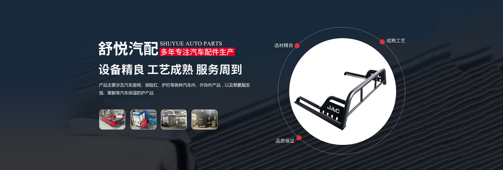 揚(yáng)州舒悅汽配有限公司經(jīng)過(guò)多年的穩(wěn)定發(fā)展,業(yè)績(jī)一直蒸蒸日上。公司產(chǎn)品主要涉及汽車座椅、保險(xiǎn)杠、護(hù)欄等各種汽車內(nèi)、外飾件產(chǎn)品,以及聚氨酯發(fā)泡、聚脲等汽車保溫防護(hù)產(chǎn)品。其主要是為江淮、金龍,奇瑞等公司服務(wù),已連續(xù)多年成為江淮、金龍等公司的A級(jí)供應(yīng)商。        公司成立于1997年,現(xiàn)坐落于揚(yáng)州市儀征劉集盤古工業(yè)集中區(qū)202號(hào),公司占地面積26640平 方米,廠房建筑面積18512平方米。公司擁有先進(jìn)的制造設(shè)備、可靠的生產(chǎn)工藝、完善的檢測(cè)手段和科學(xué)的管理,在售前和售后服務(wù)中做到快速反應(yīng),應(yīng)急應(yīng)變,為客戶提供優(yōu)良產(chǎn)品和滿意服務(wù)。公司的產(chǎn)品開發(fā)能力和生產(chǎn)規(guī)模在同行業(yè)中處于前列的地位。        揚(yáng)州舒悅?cè)吮小罢\(chéng)信雙嬴”的原則,發(fā)揚(yáng)“誠(chéng)信、務(wù)實(shí)、創(chuàng)新、貢獻(xiàn)”的企業(yè)精神,恪守“顧客至上”的經(jīng)營(yíng)宗旨,致精從業(yè),不斷引進(jìn)新技術(shù)、新材料。以優(yōu)良的產(chǎn)品、合理的價(jià)格和周到的服務(wù)參與市場(chǎng)競(jìng)爭(zhēng)。公司愿與國(guó)內(nèi)外朋友建立真誠(chéng)的合作伙伴關(guān)系,攜手共創(chuàng)輝煌!